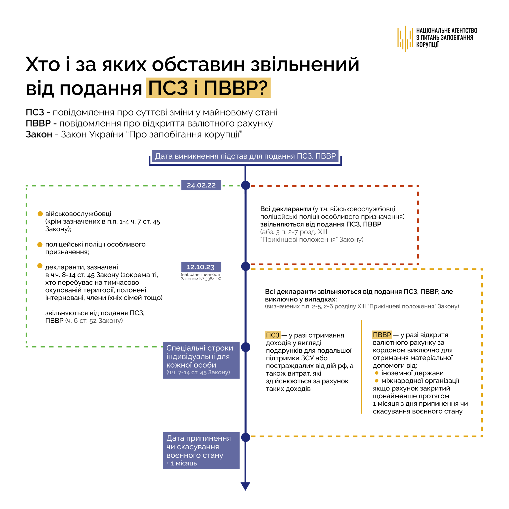 В той же час, Закон України від 20 вересня 2023 року № 3384-IX «Про внесення змін до деяких законів України про визначення порядку подання декларацій осіб, уповноважених на виконання функцій держави або місцевого самоврядування, в умовах воєнного стану» звільняє всіх суб’єктів декларування від обов’язку подання ПСЗ, ПВВР, підстави для подання яких виникли в період з 24 лютого 2022 року до 11 жовтня 2023 року включно.